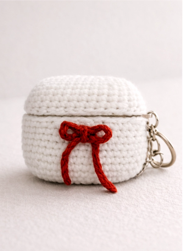 Elevate your tech with a touch of handmade charm. This hand-crocheted AirPods case features a soft, cream-colored cotton yarn base accented by a delicate, stitched red bow. It’s the perfect blend of vintage “ballet-core” aesthetics and modern functionality.