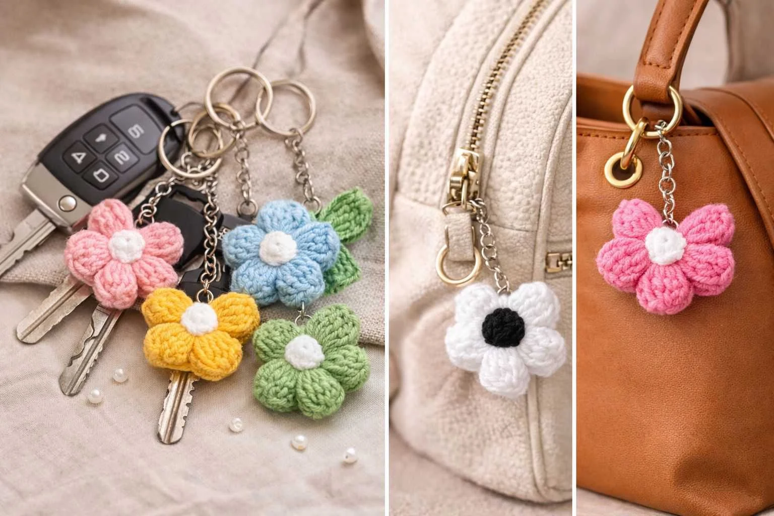 Handmade crochet flower keychain made with soft yarn and a durable metal ring. Cute, lightweight, and perfect for keys, bags, or gifting.